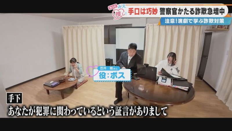 劇団の練習場では、実際の詐欺事例を忠実に再現した演劇が上演されており、観客は身近に起こりうる犯罪の手口を具体的に学ぶことができます。