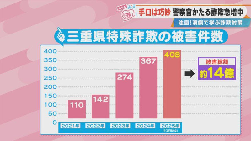 「三重県内で特殊詐欺被害は10月末時点で408件被害が出ています。被害額が約14億円となっており、過去最多のペースで推移しているところです。20代、30代の方も被害に多く遭われているという状況になっています」