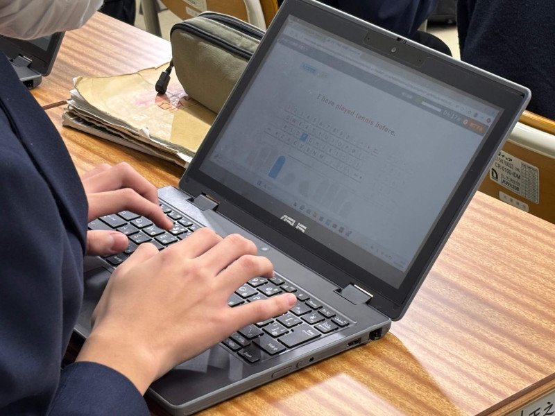 まず、普通コースで英語の授業を参観した。教室に入って驚いたことは、先生が2人いることだった。参観したこの日は、教壇でメインに授業を進めるのは“高校”の英語教師、サブにつくのが“中学校”の教師だった。授業は英語で進む。時おり、少し分かりにくい部分では、先生の口から日本語が出るものの、基本は英語。愛知県から各自に支給されているタブレットを使って、英文タイピング、リスニング、そして音読などに活用する内容だった。AIが瞬時に採点してくれるため、生徒たちはゲーム感覚でタブレットと向き合っていた。筆者の中学1年生の時とは隔世の感があったが、机上の教科書『NEW HORIZON』(東京書籍)だけは同じで、懐かしさもあって少しホッとした。
