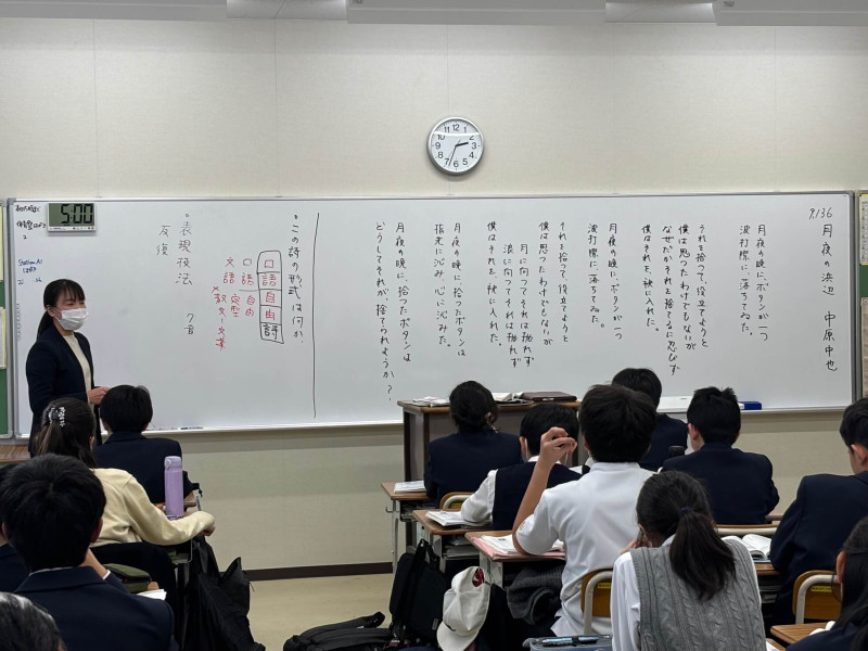 もうひとつの普通コースは、国語の授業だった。こちらも先生は2人、高校と中学校のコンビである。正面のホワイトボードには、中原中也の詩『月夜の浜辺』が書かれて、それを題材に「口語自由詩」を学んでいた。詩の中にある「反復」「対句」「反語」などを、生徒たちが次々と手を挙げて、指摘していく。感心したのは、詩の技法を学ぶだけに留まらず、月の周期とか、詩に謳われたボタンのサイズや色とか、授業が次々と展開していったことである。国語の枠にとらわれない内容は、参観しているこちらも楽しむことができた。