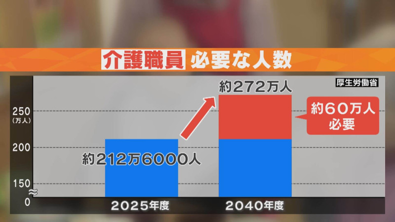 厚生労働省の調査によると、高齢化の影響で介護士の数は2040年度、現在より約60万人多い272万人が必要になる見込みです。需要に対する深刻な介護士不足が問題となっています。