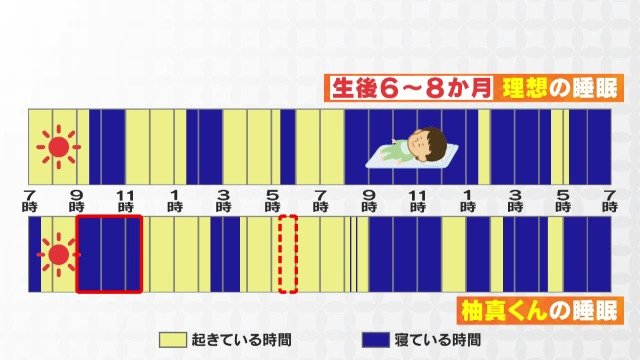 柚真くんと同じ月齢の子の理想的な一日。昼間も2時間~2時間半ごとに睡眠が必要で、それが不足するとストレスで夜にも寝つきにくいと言います。