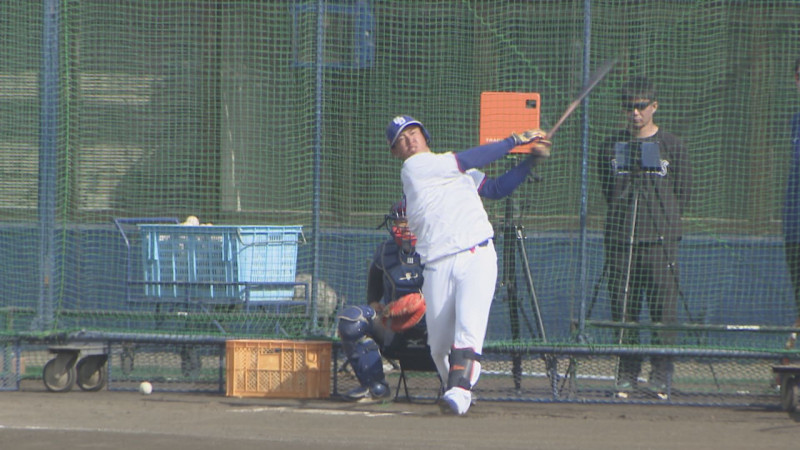 鵜飼航丞選手は、2月7日の練習前の声出しで「2ケタホームランを打って、ロマン砲と呼ばれるのを卒業したい」と宣言。その言葉を体現するように、この日も力強いスイングから快音を連発した。ネットに直撃する打球もあり、その飛距離は十分だ。