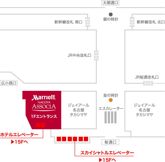 JR名古屋駅中央コンコース桜通口側の スカイシャトルエレベーター(1Fまたは2Fから) またはホテルエレベーターをご利用いただき、 15Fのフロントレセプションへお越しください。 フロントレセプション横のエスカレーターなどで 16Fタワーズボールルームへお越しいただけます。