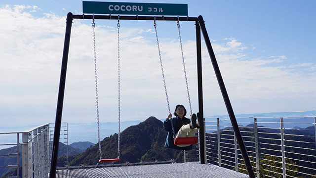 御在所岳山上公園に新たな絶景スポット「COCORU」が誕生!壮大な景色を一望できる展望テラス「COCORU」にはブランコも設置。絶景とスリルの両方を体感できる。