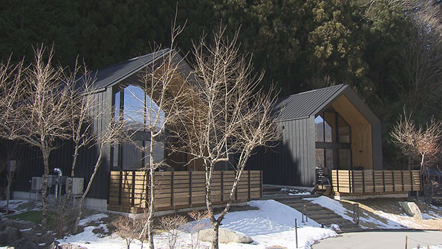 日本一の星空をテーマにした北欧風のグランピング施設。ここの施設内に去年誕生したのがリビングから星空を眺められるスイートヴィラ。木材は岐阜県産100%ヒノキを使用。星空を見てもらえるように大きな窓を設置。室内には無煙ロースターが付いていて温かい室内でBBQが出来る。また施設には体験メニューも豊富。