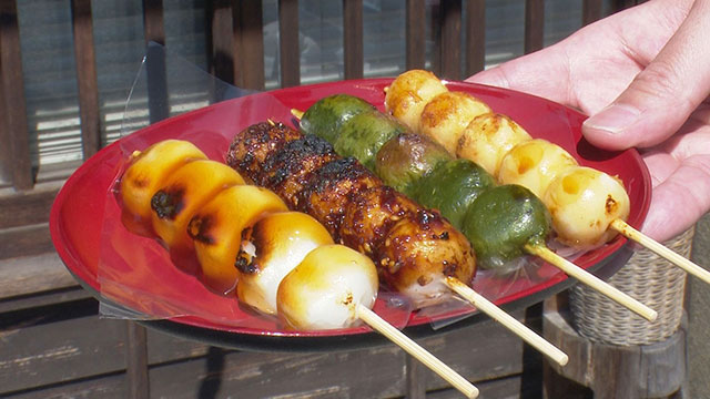 土曜、日曜と祝日のみ営業。観光客に人気の団子屋さん。自家製味噌を使った「五平餅」や米粉100%の4種類の「みたらし団子」が頂ける。