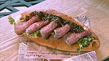 パンマニアのおススメかぶりつきグルメサンドは、“トウガラシ”という希少部位を使たローストビーフが、パンから豪快にはみ出した贅沢なグルメサンドイッチ。