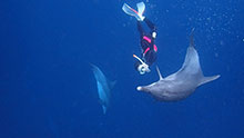 御蔵島へのドルフィンスイムツアーを開催しているダイブキッズの山崎さんにサポートしてもらいイルカとの宙返りに挑戦!