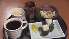 ドリンク1杯の値段で、おにぎり・おかゆ(夏季は冷やし茶漬け)・トーストの中からひとつ選ぶことができ、さらにサラダと茶碗蒸しが付いてくる。コーヒーなら410円(税込み)でモーニングサービスが付く