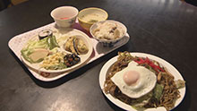 日替わりランチは、お惣菜のプレート・ご飯・汁物・漬物、そしてお好み焼きまたは焼きそばが付く。