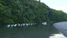 早朝、五十鈴川では神様に仕える人々の禊が行われる。五十鈴川には、酸素の多い清冽な水にしか棲めない水生昆虫「ナベブタムシ」の姿も見られる。