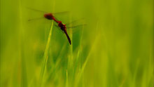 秋らしい筋雲の下、稲穂が黄色く色付いた田んぼでは、ナツアカネのオスとメスが連接し、尾を振って空中から卵を産み落とす「打空産卵」が見られる。