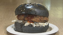 竹炭入りのバンズに桑名名産のしじみと黒のりのコロッケをサンドした『桑名ブラックバーガー』は見た目も味もインパクト大。