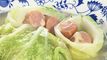 ➁ 白菜にウインナー・チーズをのせて巻く。
