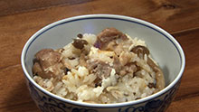➂ 炊飯器に米を入れ、2合の目盛りまで水を入れる。漬け汁と鶏肉・しめじ・油揚げをのせて、いつも通りに炊く。蒸らしたらさっくり混ぜ合わせる。