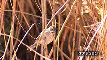 冬鳥のオオジュリンが器用に葦につかまり越冬する虫たちを食べています。
