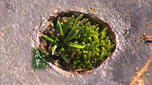 マンホールの穴に生えた苔とツメクサは、まるで小さな坪庭のようです。